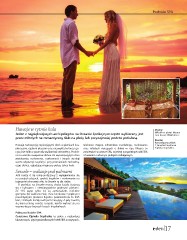 Podróże SPA Hawaje w rytmie hula U góry: Jeden z najpiękniejszych archipelagów na Oceanie Spokojnym często wybierany jest Młodzi na plaży i Mauna Lani Resort SPA&Fitness. przez młodych na romantyczny ślub na plaży lub przynajmniej podróż poślubną. Poniżej: Romantyczny widok Hawaje zachwycają zapierającymi dech w piersiach kra- Ulubione miejsce miłośników snorkelingu, nurkowania z tarasów Constance jobrazami, rajskimi plażami oraz niezwykłą kulturą i go- oraz młodych marzących o ślubie w raju. Można tu Eiphelia Seychelles. rącą (nie tylko z powodu wulkanów) atmosferą. Podob- zamieszkać w wiosce SPA, w jednej z prywatnych willi SPA no tu zostało uwięzione słońce. Po wyczerpującym dniu z basenem i własnym pokojem zabiegowym. zwiedzania, surfowania, nurkowania i innych atrakcji warto odpocząć na plaży i przy promieniach zachodzą- cego słońca, oglądając magiczny pokaz tańca hula. Seszele – wakacje pod palmami Jeśli marzy ci się urlop połączony z wylegiwaniem się na pustych plażach, spokój tropików i nurkowanie na bajecznie kolorowej rafie, to Seszele są dla ciebie. O podróży na Seszele marzy chyba każdy. Kojarzą się z luksusem i niewiarygodnie pięknymi plażami. Ze 115 wysp tylko 33 są zamieszkałe, niektóre górzyste (te wulkaniczne), inne koralowe z pięknymi piaszczystymi plażami. Łączna powierzchnia to 455 km , z których każdy metr jest czarujący. A gdy znudzą 2 się wam palmy, morze i piasek, warto wybrać się na wycieczkę po bujnych lasach tropikalnych. Polecane hotele SPA: Constance Eiphelia Seychelles to jeden z najbardziej luksusowych, pięciogwiazdkowych hoteli SPA na wyspach. 17 romantyczne miejsca_4rozkladowki_OK.indd 17 2014-07-14 16:18:54